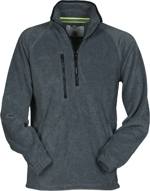 Fleecepullover mit kurzem, schwarzem 8 mm Reißverschluss aus Kunststoff, Raglanärmeln, regulierbarem Kordelzug in der Taille, elastischen Ärmelbündchen, zwei Taschen mit verdecktem Reißverschluss, einer Vordertasche mit Reißverschluss, Kragen mit verstärktem Rand in Kontrastfarbe, verstärkten Nähten
