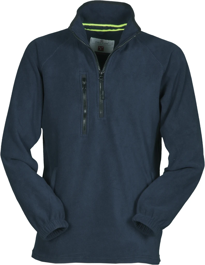 Fleecepullover mit kurzem, schwarzem 8 mm Reißverschluss aus Kunststoff, Raglanärmeln, regulierbarem Kordelzug in der Taille, elastischen Ärmelbündchen, zwei Taschen mit verdecktem Reißverschluss, einer Vordertasche mit Reißverschluss, Kragen mit verstärktem Rand in Kontrastfarbe, verstärkten Nähten