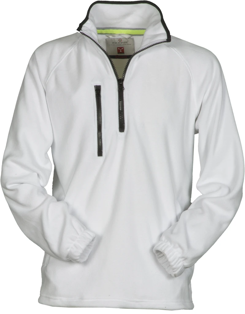 Fleecepullover mit kurzem, schwarzem 8 mm Reißverschluss aus Kunststoff, Raglanärmeln, regulierbarem Kordelzug in der Taille, elastischen Ärmelbündchen, zwei Taschen mit verdecktem Reißverschluss, einer Vordertasche mit Reißverschluss, Kragen mit verstärktem Rand in Kontrastfarbe, verstärkten Nähten