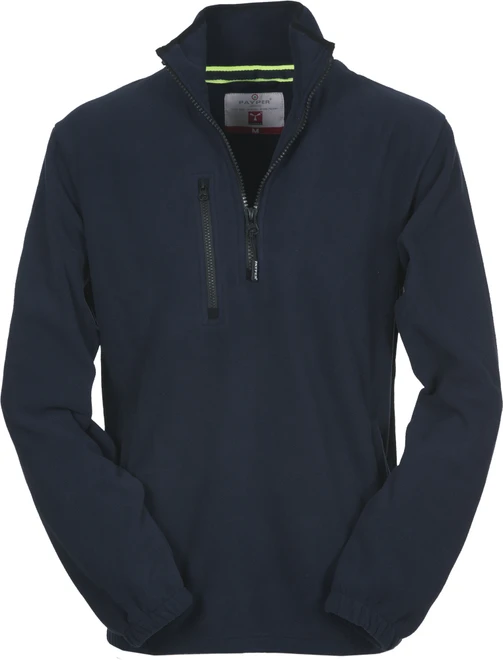 Fleecepullover mit kurzem, schwarzem Reißverschluss aus Kunststoff, Kugelärmeln, elastischen Ärmelbündchen und elastischer Taille, zwei Taschen mit verdecktem Reißverschluss,einer Vordertasche mit Reißverschluss, Kragen mit verstärktem Rand in Kontrastfarbe, verstärkten Nähten