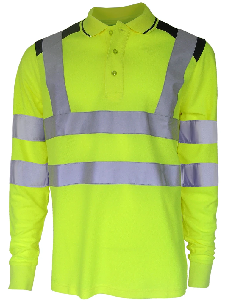 Zweifarbiges, gut sichtbares Herren-Polo-Shirt mit Reflexstreifen, langärmelig, mit 3 Knöpfen Ton-in-Ton mit Perlmutteffekt, Kragen und Ärmelrand aus Feinripp mit feinem Profil in Kontrastfarbe, Seitenschlitzen, Nackenband