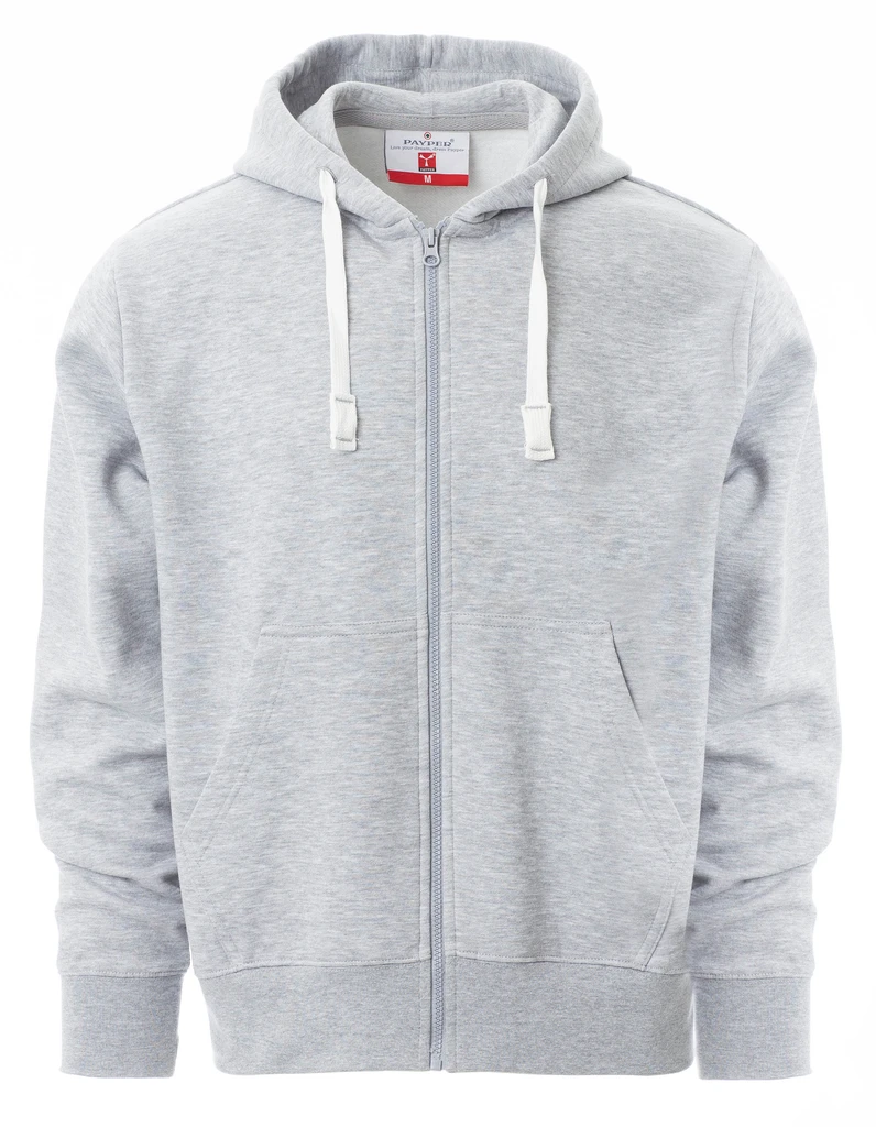 Herren-Sweatshirt, durchgehender Reißverschluss und Kapuze in gleicher Farbe, Bauchtaschen, verstärkte Nähte, Bündchen und Bund aus elastischem Rippenstrick. Gleichfarbiges Verstärkungsband im Kragen