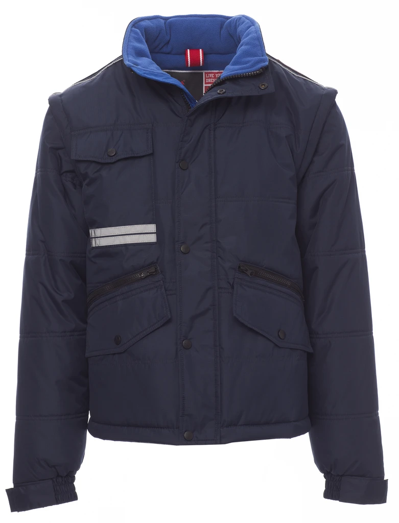 Brusttasche und einem Ring zum Befestigen des Ausweises, Reflexstreifen auf der Tasche und auf dem Rücken; Innenseite: wattiert, Fleece in Kontrastfarbe auf Rücken und Kragen, Innenreißverschluss zum einfacheren Veredeln mit Druck und Stick