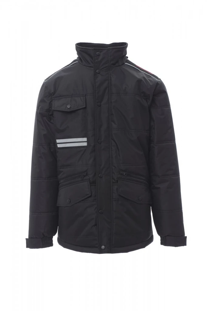 Herren-3/4-Jacke, verdeckter 8 mm Reißverschluss aus Kunststoff mit Metallschieber und Kunststoffknöpfen, abgerundeter Rücken, im Kragen verstaubare Kapuze, 2 Außentaschen mit LOCK SYSTEM und 2 mit Reißverschluss, schräg stehende Taschen, um das Einführen der Hand zu erleichtern, 1 Smartphone-Brusttasche und Ring zum Befestigen des Ausweises, Reflexstreifen auf der Tasche und auf dem Rücken. Innenseite: wattiert, Fleece in Kontrastfarbe auf Rücken und Kragen, 1 Tasche, Innenreißverschluss zum einfacheren Veredeln mit Druck und Stick