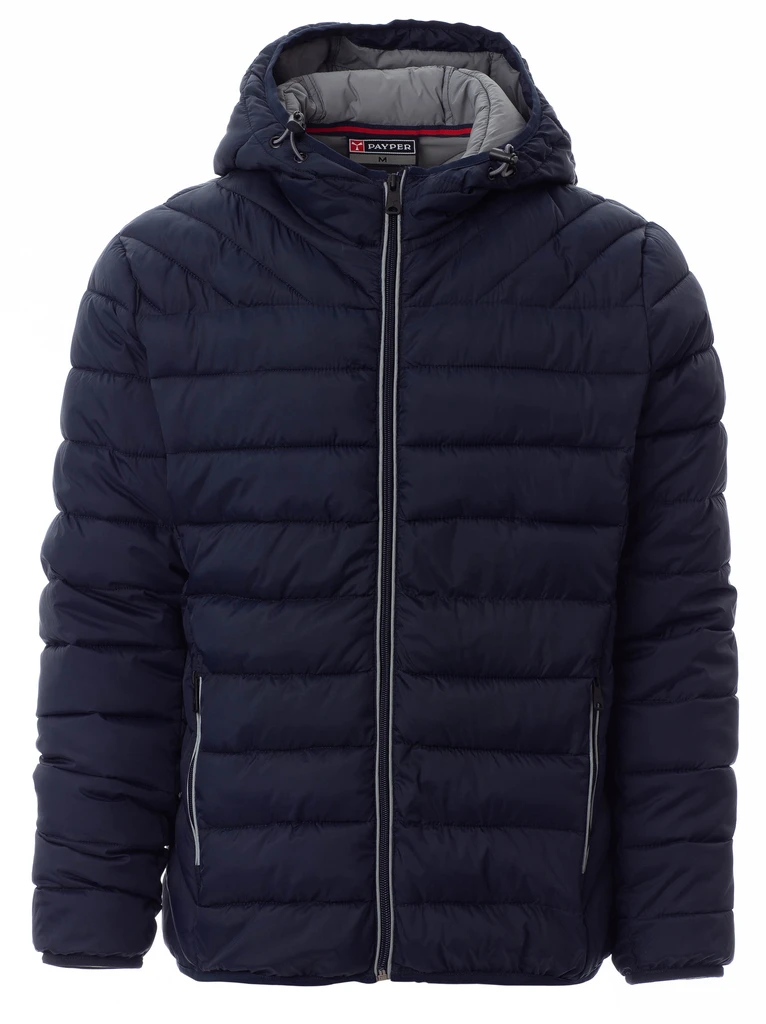 Leichte Herren-Kapuzenjacke / Daunenjacke, 5-mm-SBS-Kunststoffreißverschluss mit Metallzug, schmaler Bündchen und Saum, zwei Außentaschen. Futter: Feder-Polyester-Polsterung, zwei Taschen