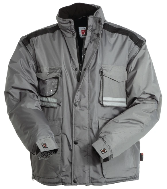Herren-Jacke, abtrennbare Ärmel, verdeckter 8 mm Reißverschluss aus Kunststoff mit Metallschieber und Kunststoffknöpfen, im Kragen einrollbare Kapuze, regulierbare Ärmelbündchen, Reflexstreifen Ton-in-Ton vorne und hinten, Seitenschlitz mit Ziehharmonikafalte und Reißverschluss, 5 Außentaschen, davon 1 mit nach innen wendbarem Ausweisfach. Innenseite: wattiert, Kragen, Rücken- und Nierenschutz aus Mikrofleece, atmungsaktive Einsätze unter den Armen, Kordelzug in der Taille und Innenreißverschluss zum einfacheren Veredeln mit Druck und Stick