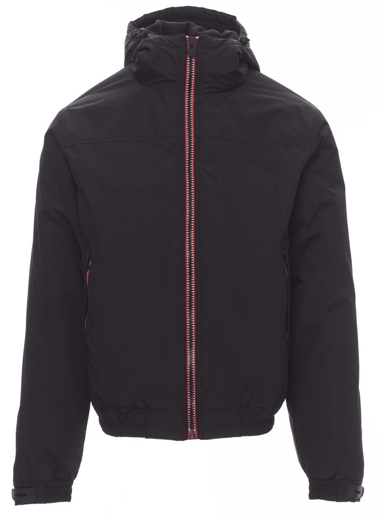 Herren-Jacke mit Reißverschluss in Kontrastfarbe, Kapuze, elastischer Taille und Ärmelbündchen mit Gummilaschen zur Weitenregulierung, zwei Außentaschen mit verdecktem Reißverschluss; Innenseite: wattiert, Mikrofleece im Kragen und in der Rückenpartie, eine Reißverschlusstasche mit Kabelöffnung
