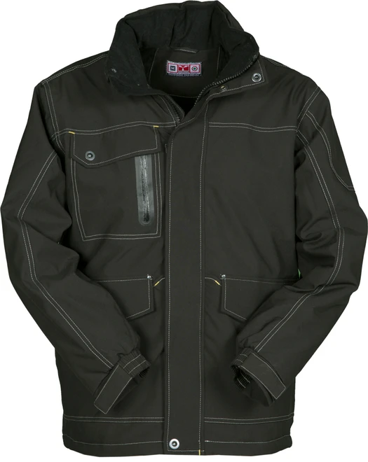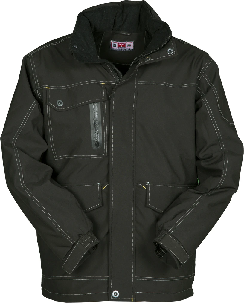 Ärmelbündchen, vier geräumigen Vordertaschen, davon zwei mit Patte und Reißverschluss, zwei in Brusthöhe mit versiegeltem Reißverschluss, Druckknöpfen aus Metall, Kontrastnähten in der Farbe