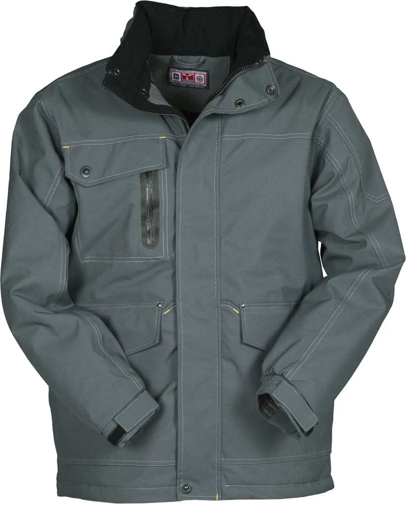Ärmelbündchen, vier geräumigen Vordertaschen, davon zwei mit Patte und Reißverschluss, zwei in Brusthöhe mit versiegeltem Reißverschluss, Druckknöpfen aus Metall, Kontrastnähten in der Farbe