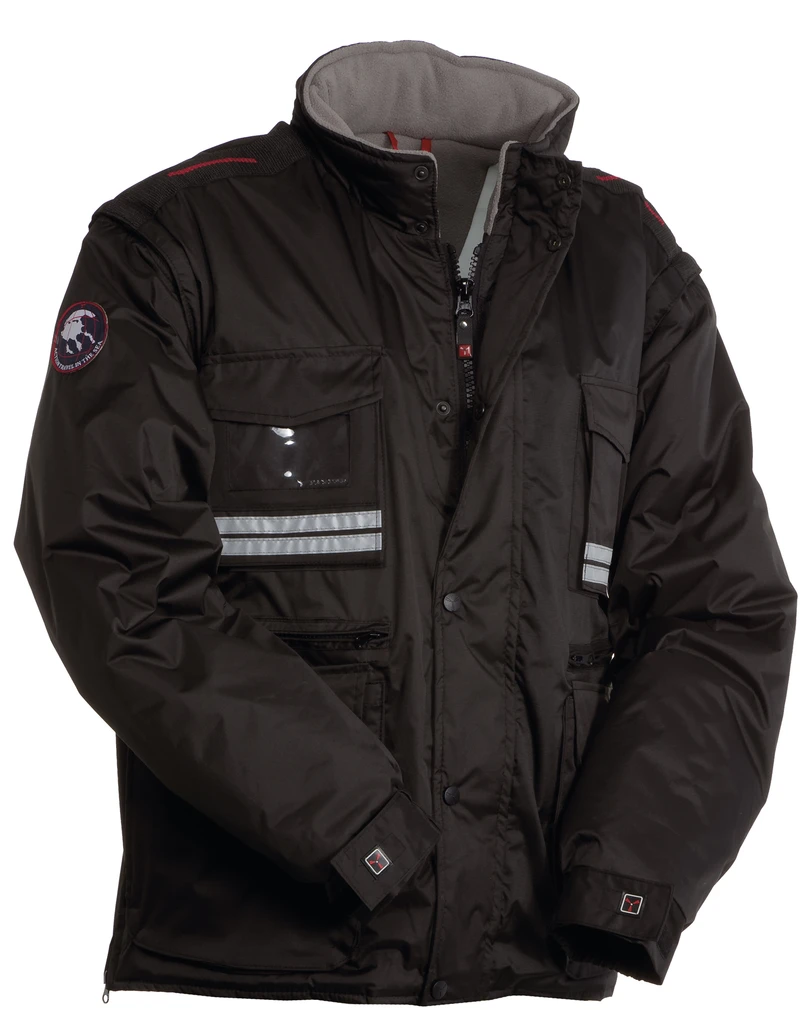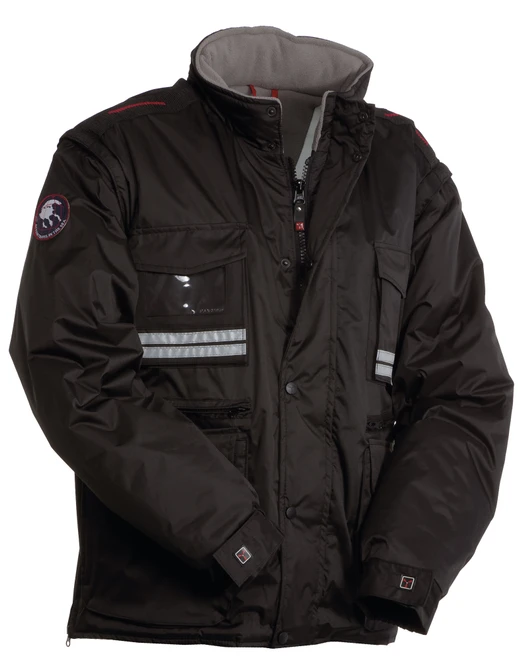 Herren-Jacke mit abtrennbaren Ärmeln, verdecktem 8 mm Reißverschluss aus Kunststoff mit Metallschieber und Kunststoffknöpfen, vorgeformter, abnehmbarer oder im Kragen einrollbarer Kapuze, regulierbaren Ärmelbündchen, grauen Reflexstreifen vorne und hinten, vorgeformten Ellbogen und Seitenschlitz mit Ziehharmonikafalte und Reißverschluss, neun Außentaschen, davon zwei mit LOCK SYSTEM, zwei mit Reißverschluss und verstärkter Innenseite, einer mit nach innen wendbarem Ausweisfach; Innenseite: wattiert, Kragen, Rücken- und Nierenschutz aus Mikrofleece, atmungsaktive Einsätze, Kordelzug in der Taille und Innenreißverschluss