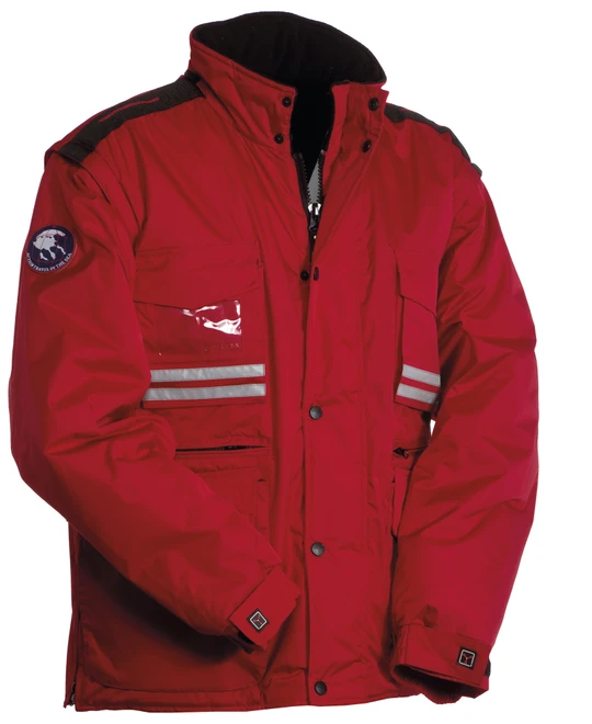 Herren-Jacke mit abtrennbaren Ärmeln, verdecktem 8 mm Reißverschluss aus Kunststoff mit Metallschieber und Kunststoffknöpfen, vorgeformter, abnehmbarer oder im Kragen einrollbarer Kapuze, regulierbaren Ärmelbündchen, grauen Reflexstreifen vorne und hinten, vorgeformten Ellbogen und Seitenschlitz mit Ziehharmonikafalte und Reißverschluss, neun Außentaschen, davon zwei mit LOCK SYSTEM, zwei mit Reißverschluss und verstärkter Innenseite, einer mit nach innen wendbarem Ausweisfach; Innenseite: wattiert, Kragen, Rücken- und Nierenschutz aus Mikrofleece, atmungsaktive Einsätze, Kordelzug in der Taille und Innenreißverschluss