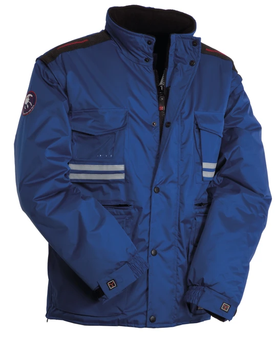 Herren-Jacke mit abtrennbaren Ärmeln, verdecktem 8 mm Reißverschluss aus Kunststoff mit Metallschieber und Kunststoffknöpfen, vorgeformter, abnehmbarer oder im Kragen einrollbarer Kapuze, regulierbaren Ärmelbündchen, grauen Reflexstreifen vorne und hinten, vorgeformten Ellbogen und Seitenschlitz mit Ziehharmonikafalte und Reißverschluss, neun Außentaschen, davon zwei mit LOCK SYSTEM, zwei mit Reißverschluss und verstärkter Innenseite, einer mit nach innen wendbarem Ausweisfach; Innenseite: wattiert, Kragen, Rücken- und Nierenschutz aus Mikrofleece, atmungsaktive Einsätze, Kordelzug in der Taille und Innenreißverschluss