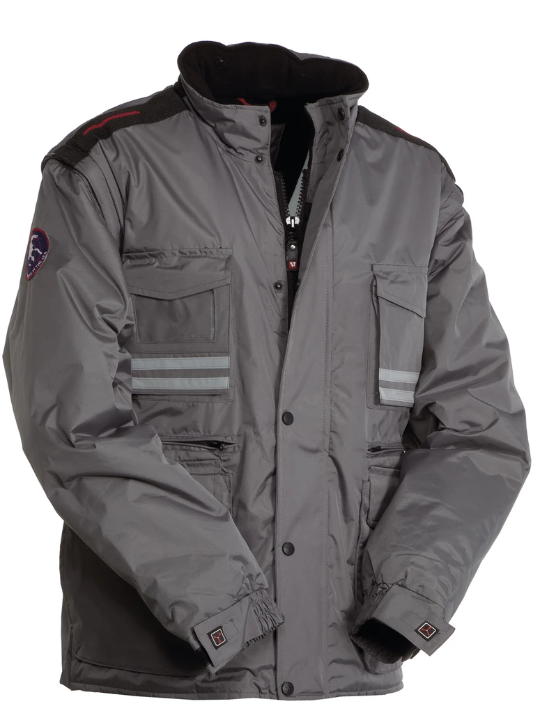 Herren-Jacke mit abtrennbaren Ärmeln, verdecktem 8 mm Reißverschluss aus Kunststoff mit Metallschieber und Kunststoffknöpfen, vorgeformter, abnehmbarer oder im Kragen einrollbarer Kapuze, regulierbaren Ärmelbündchen, grauen Reflexstreifen vorne und hinten, vorgeformten Ellbogen und Seitenschlitz mit Ziehharmonikafalte und Reißverschluss, neun Außentaschen, davon zwei mit LOCK SYSTEM, zwei mit Reißverschluss und verstärkter Innenseite, einer mit nach innen wendbarem Ausweisfach; Innenseite: wattiert, Kragen, Rücken- und Nierenschutz aus Mikrofleece, atmungsaktive Einsätze, Kordelzug in der Taille und Innenreißverschluss