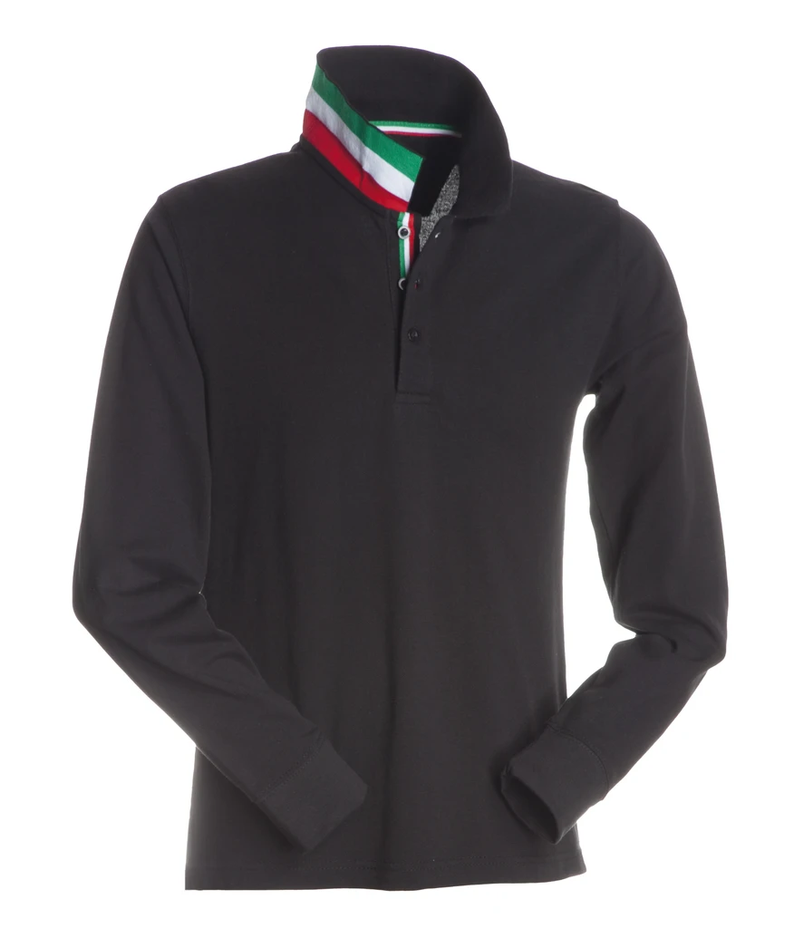 Langärmeliges Herren-Poloshirt mit 3, dazu passenden Perlmutt-Effektknöpfen, passendem Kragen, mit kontrastierender Unterseite (Farben der Flagge). Innere Knopfleiste und Seitenschlitze mit Farben der Flagge, Rippkragen und Ärmelabschluss, verdeckte Kragensteppung, Seitenverstärkungsband, Nackenband innen