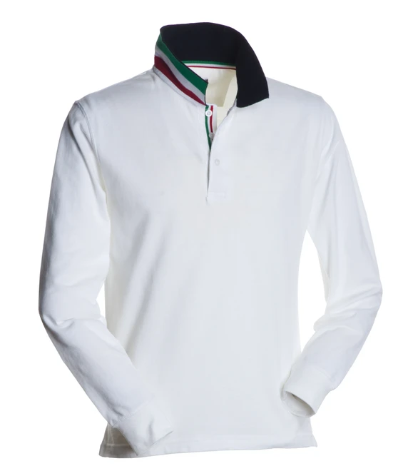 Langärmeliges Herren-Poloshirt mit 3, dazu passenden Perlmutt-Effektknöpfen, passendem Kragen, mit kontrastierender Unterseite (Farben der Flagge). Innere Knopfleiste und Seitenschlitze mit Farben der Flagge, Rippkragen und Ärmelabschluss, verdeckte Kragensteppung, Seitenverstärkungsband, Nackenband innen