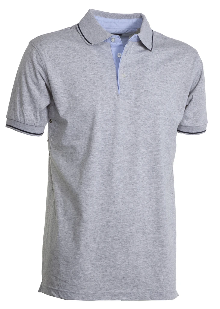 Herren-Polo-Shirt, kurzärmelig, mit 3 weißen Knöpfen, Innenseite des Kragens, der Knopfleiste und Seitenschlitze in Oxford-Hellblau, Kragen und Ärmelrand aus Rippstrick mit feiner kontrastfarbiger Einfassung, Lüftungsösen unter den Achseln, Seitenschlitzen mit Verstärkungsnaht, seitlichem Verstärkungsband, Stretchnähten, Nackensattel