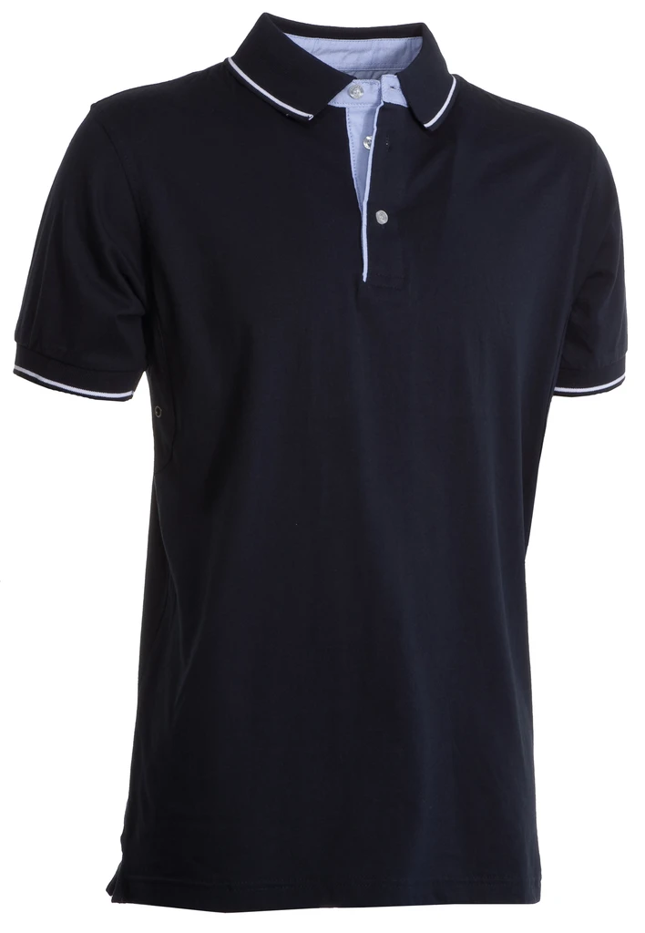 Herren-Polo-Shirt, kurzärmelig, mit 3 weißen Knöpfen, Innenseite des Kragens, der Knopfleiste und Seitenschlitze in Oxford-Hellblau, Kragen und Ärmelrand aus Rippstrick mit feiner kontrastfarbiger Einfassung, Lüftungsösen unter den Achseln, Seitenschlitzen mit Verstärkungsnaht, seitlichem Verstärkungsband, Stretchnähten, Nackensattel