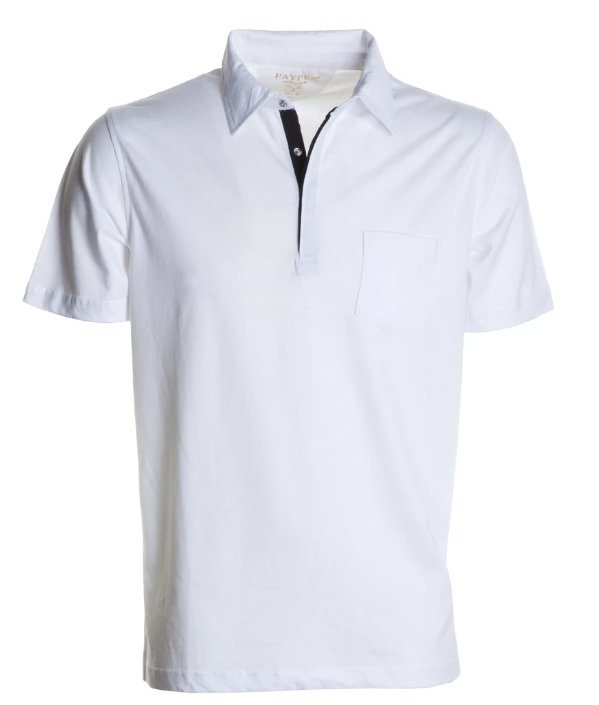 Herren-Polo-Shirt, kurzärmelig, mit 3 Metalldruckknöpfen und einer tiefen, dezenten Öffnung des Kragens auf der Vorderseite, kleiner Brusttasche, Jerseykragen im Hemdenschnitt, Transfer-Etikett, Nackensattel