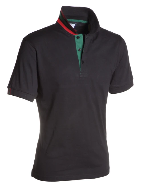 Herren-Polo-Shirt kurzärmelig, mit 3 Knöpfen Ton-in-Ton und Perlmutteffekt, Oberseite des Kragens Ton-in-Ton, Unterseite mit farbigen Kontraststreifen, die nur bei aufgestelltem Kragen sichtbar sind;