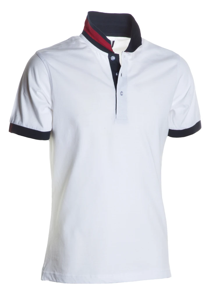 Herren-Polo-Shirt kurzärmelig, mit 3 Knöpfen Ton-in-Ton und Perlmutteffekt, Oberseite des Kragens Ton-in-Ton, Unterseite mit farbigen Kontraststreifen, die nur bei aufgestelltem Kragen sichtbar sind;