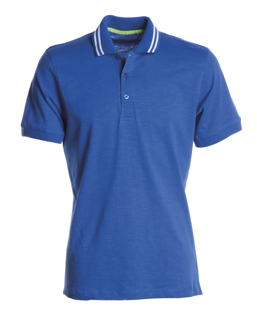 Herren-Polo-Shirt, kurzärmelig, mit 3 Knöpfen Ton-in-Ton und Perlmutteffekt, Oberseite des Kragens mit Kontraststreifen, Unterseite mit Leuchtstreifen, die nur bei aufgestelltem Kragen sichtbar sind, mit Kragen und Ärmelrand aus Feinripp, Seitenschlitzen, Leuchtband