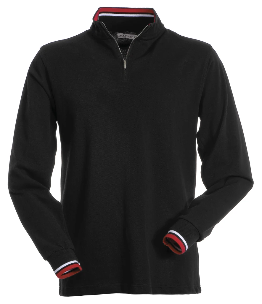 Polo-Shirt, langärmelig, mit kurzem Reißverschluss aus Metall, hoch geschnittenem Kragen, geradem Schnitt, elastischem Rippstrickbündchen, Profilen in Kontrastfarben an der Innenseite des