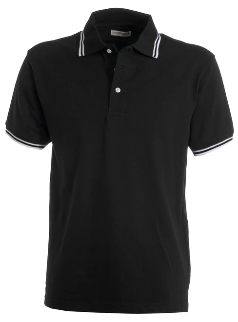 Herren-Polo-Shirt, kurzärmelig, mit 3 weißen Knöpfen, Kragen und Ärmelrand mit feiner kontrastfarbiger Einfassung, Kragen und Ärmelrand aus Feinripp, Seitenschlitzen mit Verstärkungsnaht, Nackenband, seitlichem Verstärkungsband, Stretchnähten, Nackensattel