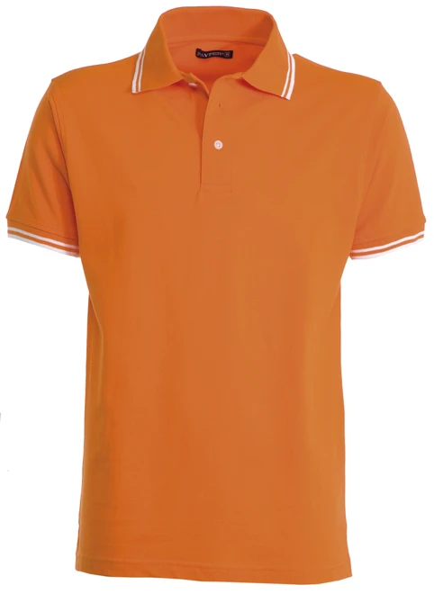 Herren-Polo-Shirt, kurzärmelig, mit 3 weißen Knöpfen, Kragen und Ärmelrand mit feiner kontrastfarbiger Einfassung, Kragen und Ärmelrand aus Feinripp, Seitenschlitzen mit Verstärkungsnaht, Nackenband, seitlichem Verstärkungsband, Stretchnähten, Nackensattel