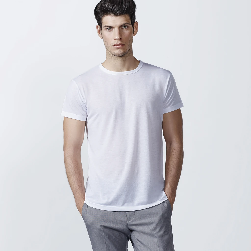 Kurzarm T-Shirt. Rundhalsausschnitt. Krageneinfassung im gleichen Material, Seitennähte. Polyester mit Baumwollfeeling.