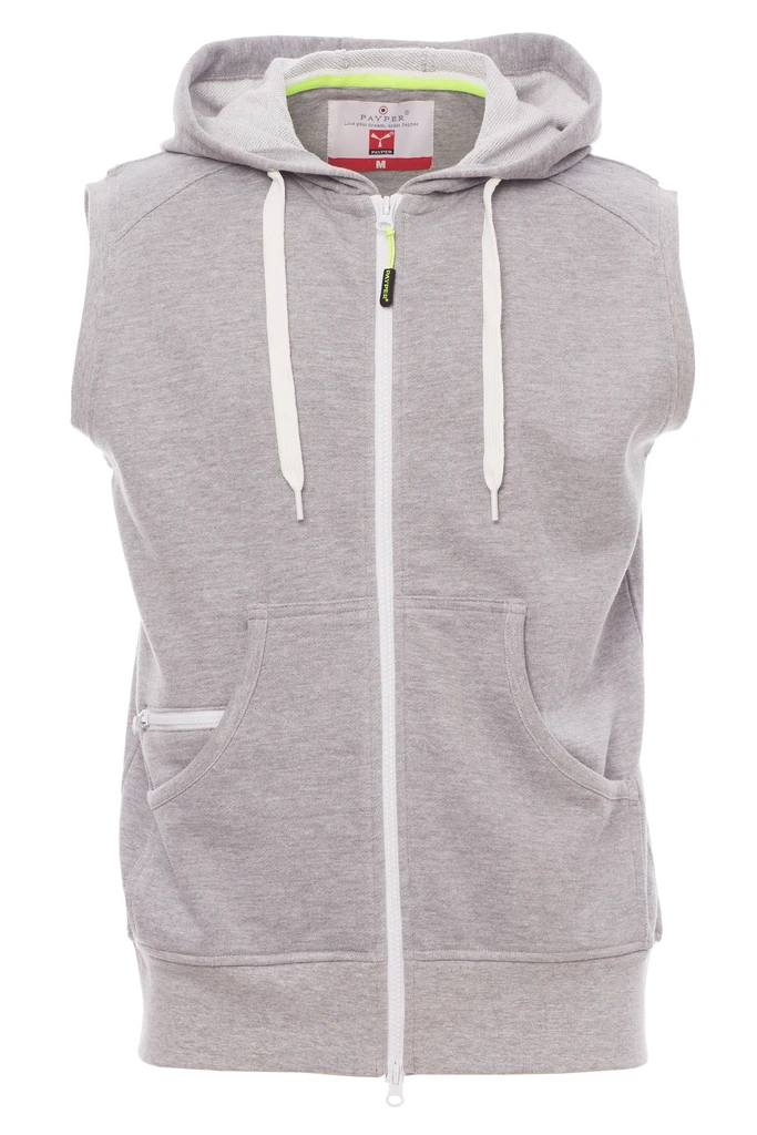Ärmelloser Kapuzenpullover für Männer, vollplastischer Reißverschluss in Kontrastfarbe mit doppeltem Metallzug, Kapuze und Kordelzug in Kontrastfarbe, Kängurutasche mit kleiner Reißverschlusstasche