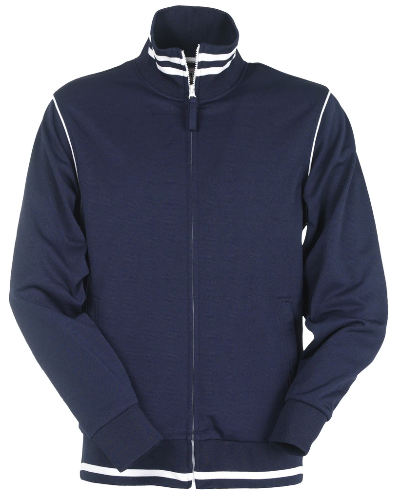 Herren-Sweatjacke mit durchgehendem, verdecktem 2-Wege-Reißverschluss aus Kunststoff in Kontrastfarbe mit Metallschieber, Rippstrickbündchen mit Kontraststreifen an Kragen und Taille, elastischem Feinripp an den Ärmeln, Paspelierung am Ärmeleinsatz, zwei Seitentaschen mit Reißverschluss, verstärkten Nähten, Piqué-ähnlicher Außenverarbeitung für eine hohe Atmungsfähigkeit des Gewebes