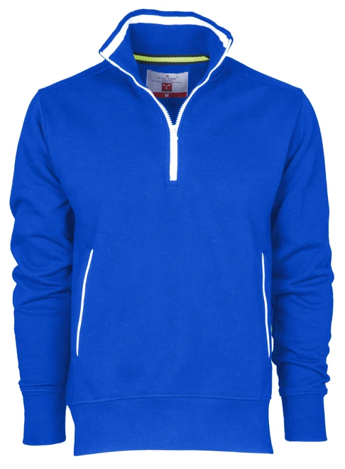 Sweatshirt mit kurzem Kunststoffreißverschluss in Kontrastfarbe, Metallschieber, kontrastfarbiger Einfassung am Kragen und an den Seitentaschen, elastischem Feinripp an Kragen, Ärmeln und Taille, verstärkten Nähten
