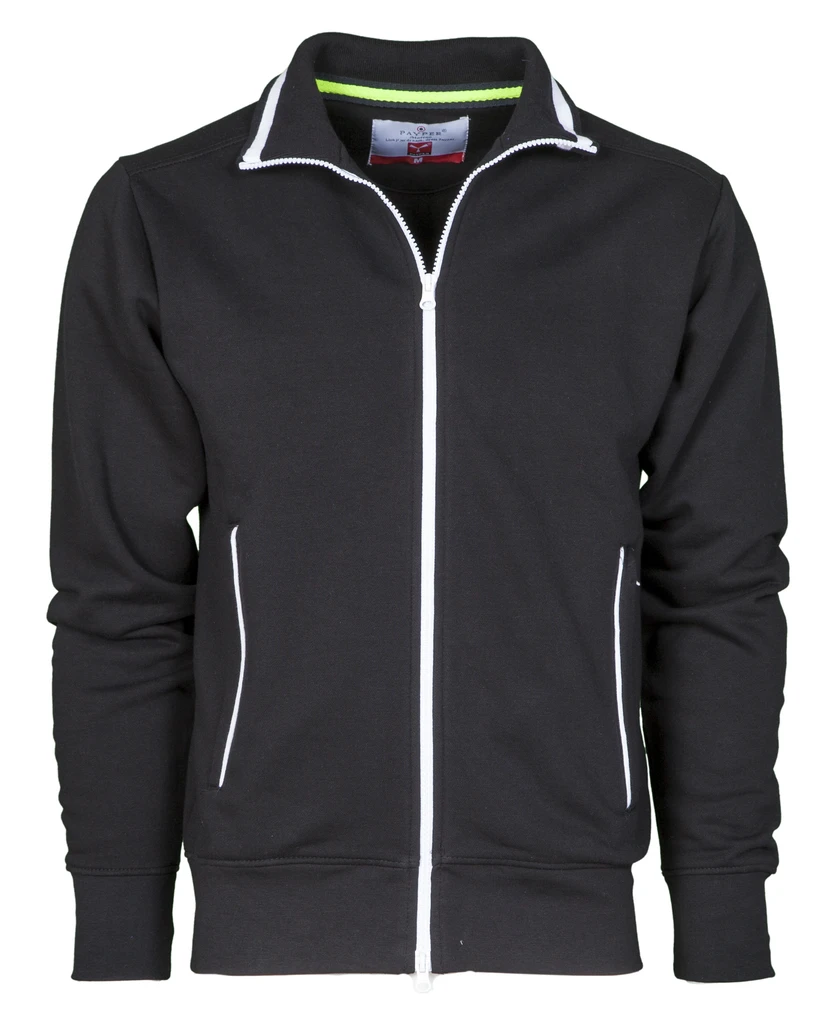 Herren-Sweatjacke mit durchgehendem 2-Wege-SBS-Reißverschluss aus Kunststoff in Kontrastfarbe mit Metallschieber, kontrastfarbiger Einfassung auf dem Rippstrickkragen und auf den Seitentaschen, Kugelärmeln, zwei Außentaschen mit Reißverschlüssen in Kontrastfarbe, elastischem Feinripp an Ärmeln und Taille, verstärkten Nähten