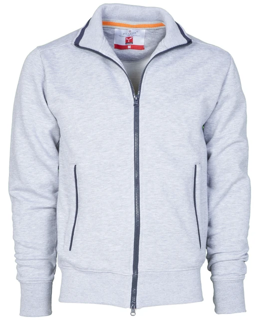 Herren-Sweatjacke mit durchgehendem 2-Wege-SBS-Reißverschluss aus Kunststoff in Kontrastfarbe mit Metallschieber, kontrastfarbiger Einfassung auf dem Rippstrickkragen und auf den Seitentaschen, Kugelärmeln, zwei Außentaschen mit Reißverschlüssen in Kontrastfarbe, elastischem Feinripp an Ärmeln und Taille, verstärkten Nähten
