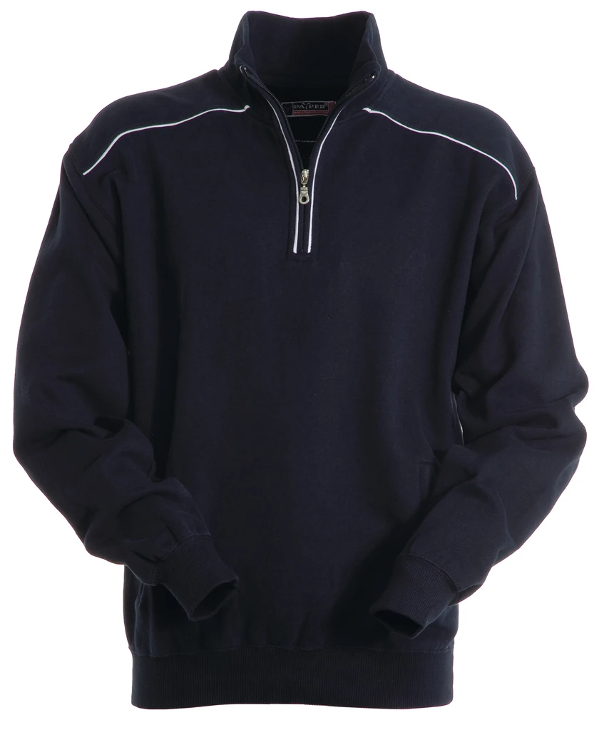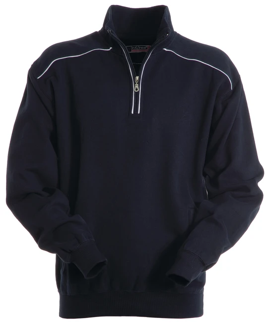 Sweatshirt mit kurzem gleichfarbigem Reißverschluss aus Kunststoff mit Metallschieber, kontrastfarbiger Einfassung an den Schultern, am Reißverschlussrand und auf dem Rücken, zwei Reißverschlusstaschen, elastischem Feinripp an Ärmeln und Taille