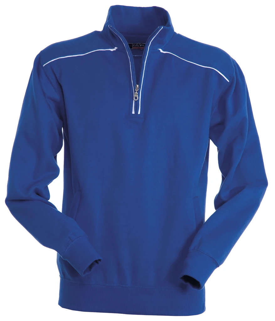 Sweatshirt mit kurzem gleichfarbigem Reißverschluss aus Kunststoff mit Metallschieber, kontrastfarbiger Einfassung an den Schultern, am Reißverschlussrand und auf dem Rücken, zwei Reißverschlusstaschen, elastischem Feinripp an Ärmeln und Taille