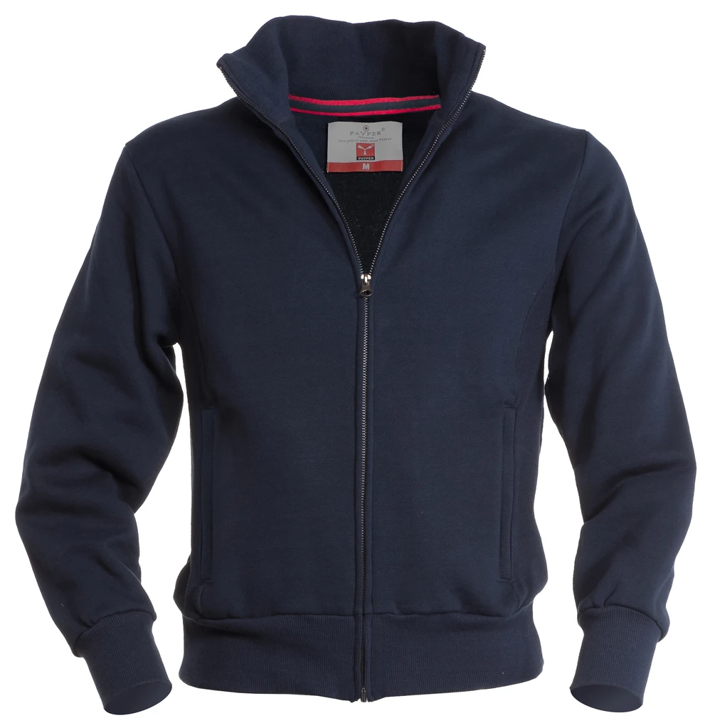 Herren-Sweatjacke mit durchgehendem SBS-Reißverschluss und Metallschieber, anliegendem Rippstrickbund, zwei Taschen mit Reißverschluss, Ärmelbündchen, Taille und Kragen aus elastischem Rippstrick, verstärkten Nähten