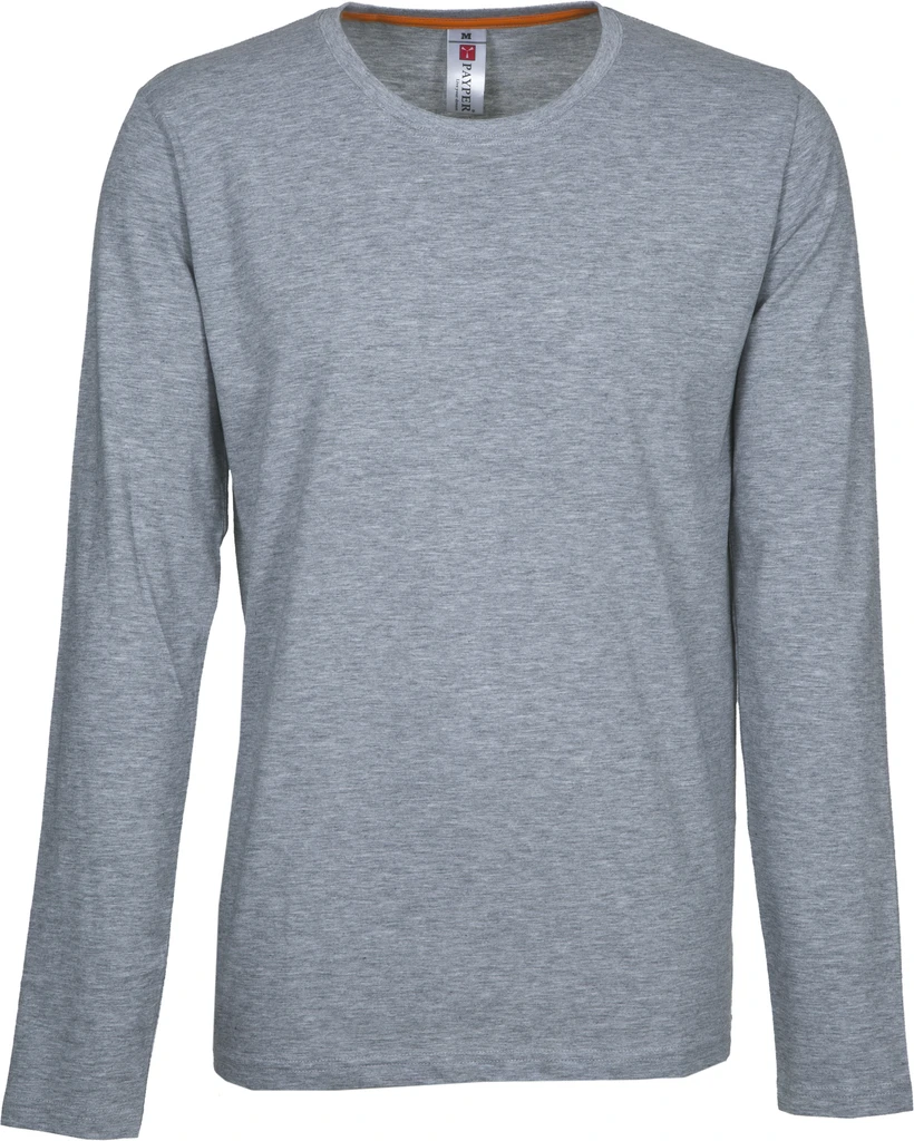 Herren-T-Shirt mit Rundhalsausschnitt, langärmelig, Feinripp-Kragen 1,5 cm aus Spandex- Mischgewebe mit Kappnaht an der Vorderseite, Verstärkungsband in Kontrastfarbe von Schulter zu Schulter, das im Kragen sichtbar ist, Stretchnähten, Seitennaht