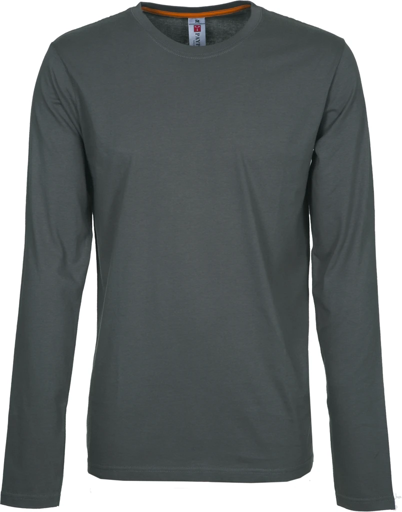 Herren-T-Shirt mit Rundhalsausschnitt, langärmelig, Feinripp-Kragen 1,5 cm aus Spandex- Mischgewebe mit Kappnaht an der Vorderseite, Verstärkungsband in Kontrastfarbe von Schulter zu Schulter, das im Kragen sichtbar ist, Stretchnähten, Seitennaht
