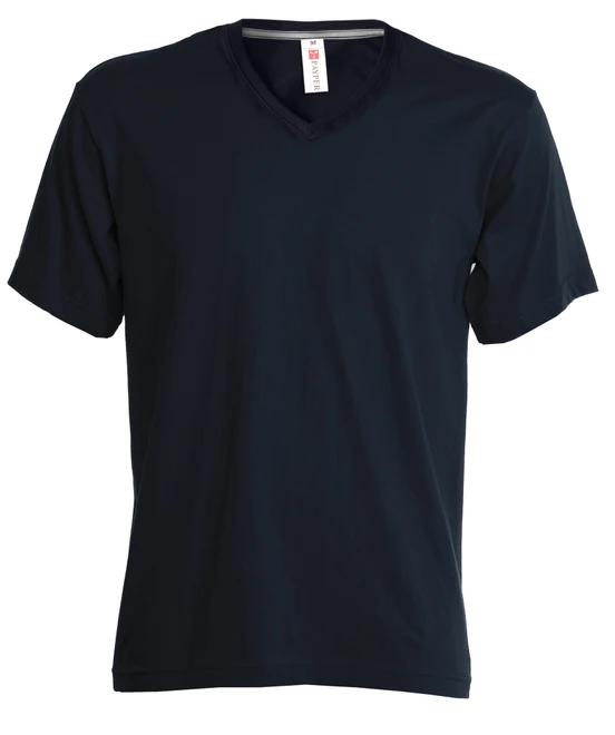 Herren-T-Shirt mit V-Ausschnitt, kurzärmelig, Feinripp-Kragen 1,5 cm aus Spandex- Mischgewebe mit Kappnaht an der Vorderseite, Verstärkungsband in Kontrastfarbe von Schulter zu Schulter, das im Kragen sichtbar ist, Stretchnähten, Rundstrick