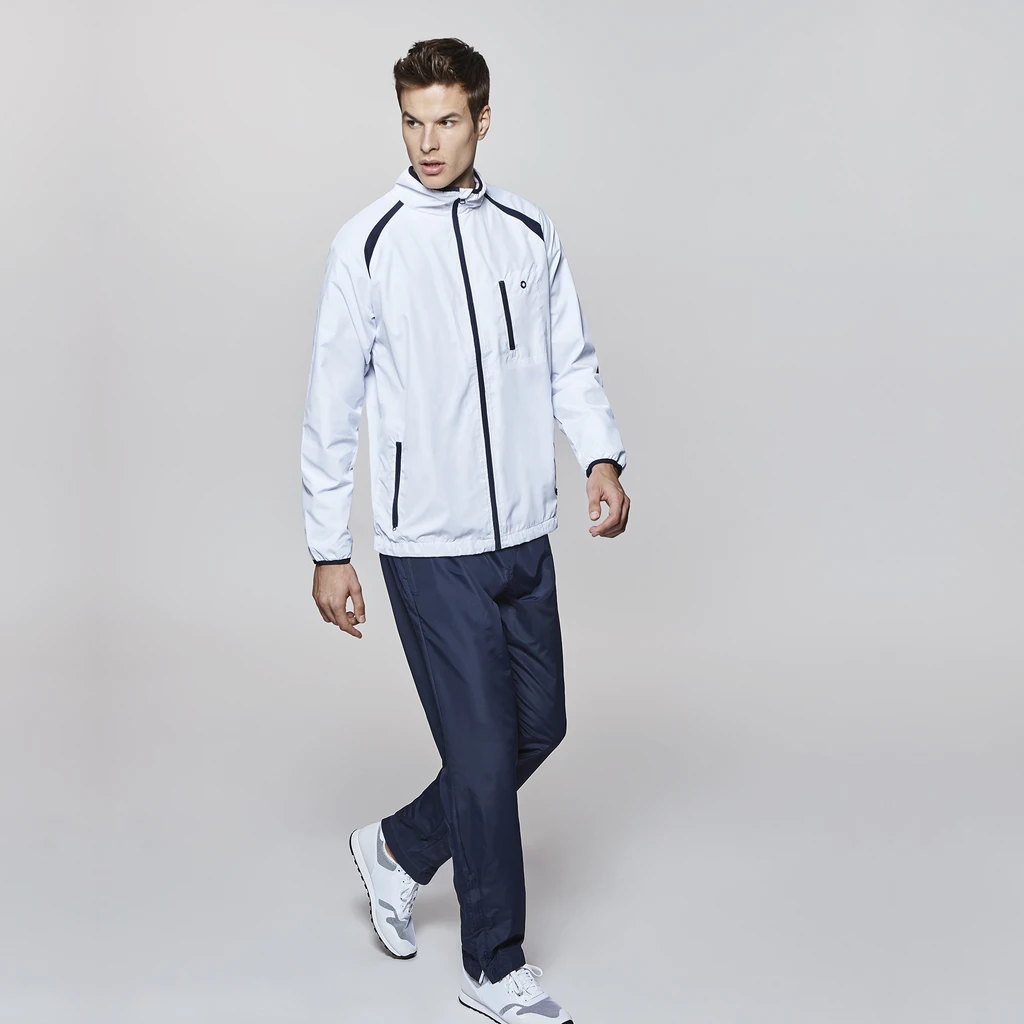 Herren Trainingsanzug. Jacke - Kontrastfarben bei durchgehendem Reißverschluss mit Kinnschutz, bei Reißverschlüssen der Seitentaschen und der linken Brusttasche mit Öse für Kopfhörerkabel und bei den Stoffeinsätzen an den Ärmeln und Ärmelbündchen. Netzinnenfutter. Gummiband im Saum mit Feststeller.