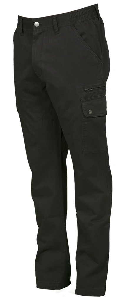 Winter-Herrenhose mit seitlich dehnbarem Bund und Gürtelschlaufen, Hosenschlitz mit Metallreißverschluss und -knopf, zwei klassisch geschnittenen Vordertaschen, zwei Seitentaschen mit Patte und Druckknöpfen, einer Reißverschlusstasche links, einer Einstecktasche für den Zollstock rechts, zwei Gesäß-Leistentaschen mit Knopf und Knopfloch