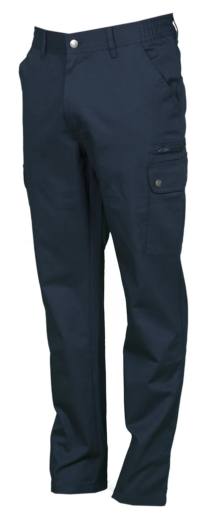 Winter-Herrenhose mit seitlich dehnbarem Bund und Gürtelschlaufen, Hosenschlitz mit Metallreißverschluss und -knopf, zwei klassisch geschnittenen Vordertaschen, zwei Seitentaschen mit Patte und Druckknöpfen, einer Reißverschlusstasche links, einer Einstecktasche für den Zollstock rechts, zwei Gesäß-Leistentaschen mit Knopf und Knopfloch