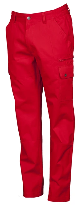 Ganzjährig tragbare Herrenhose mit seitlich dehnbarem Bund und Gürtelschlaufen, Hosenschlitz mit Metallreißverschluss und -knopf, zwei klassisch geschnittenen Vordertaschen, zwei Seitentaschen mit Patte und Druckknöpfen, einer Reißverschlusstasche links, einer Einstecktasche für den Zollstock rechts, zwei Gesäß-Leistentaschen mit Knopf und Knopfloch