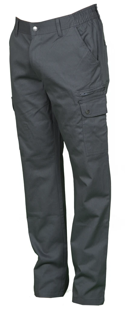 Ganzjährig tragbare Herrenhose mit seitlich dehnbarem Bund und Gürtelschlaufen, Hosenschlitz mit Metallreißverschluss und -knopf, zwei klassisch geschnittenen Vordertaschen, zwei Seitentaschen mit Patte und Druckknöpfen, einer Reißverschlusstasche links, einer Einstecktasche für den Zollstock rechts, zwei Gesäß-Leistentaschen mit Knopf und Knopfloch