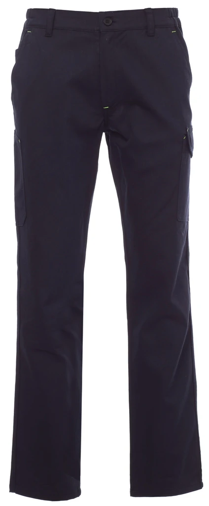 Hose mit Gürtelschlaufen und elastischem Bund, Reißverschluss und Knopfverschluss. Doppelte Nähte an Schritt und Beininnenseite, zwei klassische Fronttaschen, eine Münztasche, eine seitliche Maßbandtasche, eine linke Seitentasche mit LOCK SYSTEM-Klappenverschluss, zwei Gesäßtaschen, eine mit Klappe und Klettverschluss