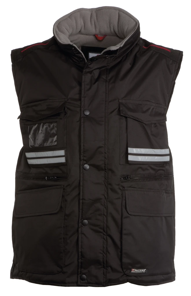 Herren-Weste mit verdecktem 8 mm Reißverschluss aus Kunststoff mit Metallschieber und Kunststoffknöpfen, vorgeformter, abnehmbarer oder im Kragen einrollbarer Kapuze, grauen Reflexstreifen vorne und hinten, Seitenschlitz mit Ziehharmonikafalte und Reißverschluss, neun Außentaschen, davon zwei mit