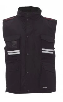 Herren-Weste mit verdecktem 8 mm Reißverschluss aus Kunststoff mit Metallschieber und Kunststoffknöpfen, vorgeformter, abnehmbarer oder im Kragen einrollbarer Kapuze, grauen Reflexstreifen vorne und hinten, Seitenschlitz mit Ziehharmonikafalte und Reißverschluss, neun Außentaschen, davon zwei mit