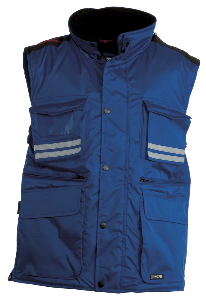Herren-Weste mit verdecktem 8 mm Reißverschluss aus Kunststoff mit Metallschieber und Kunststoffknöpfen, vorgeformter, abnehmbarer oder im Kragen einrollbarer Kapuze, grauen Reflexstreifen vorne und hinten, Seitenschlitz mit Ziehharmonikafalte und Reißverschluss, neun Außentaschen, davon zwei mit