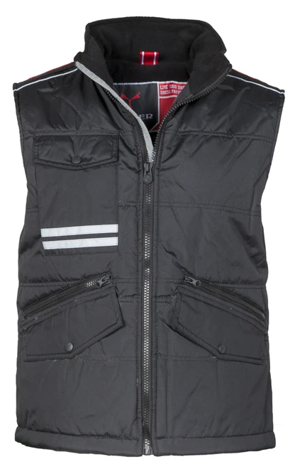 Taillierte Herren-Weste mit Reißverschluss, zwei Außentaschen mit LOCK SYSTEM und zwei mit Reißverschluss, schräg stehenden Taschen, um das Einführen der Hand zu erleichtern, einer Handy-Brusttasche und einem Ring zum Befestigen des Ausweises, Reflexstreifen auf der Tasche und auf dem Rücken; Innenseite: wattiert, Fleece in Kontrastfarbe auf Rücken und Kragen, Innenreißverschluss zum einfacheren Veredeln mit Druck und Stick